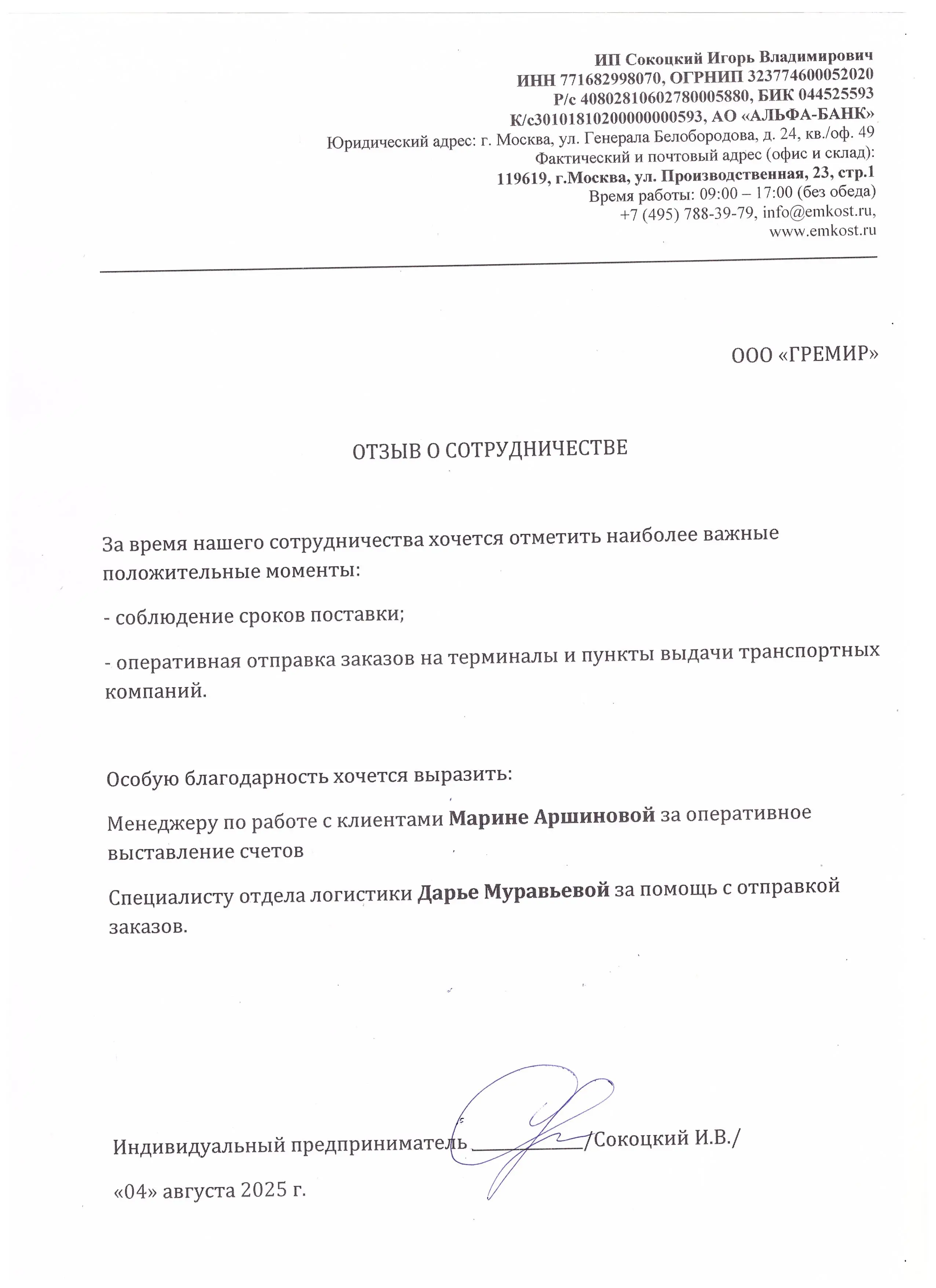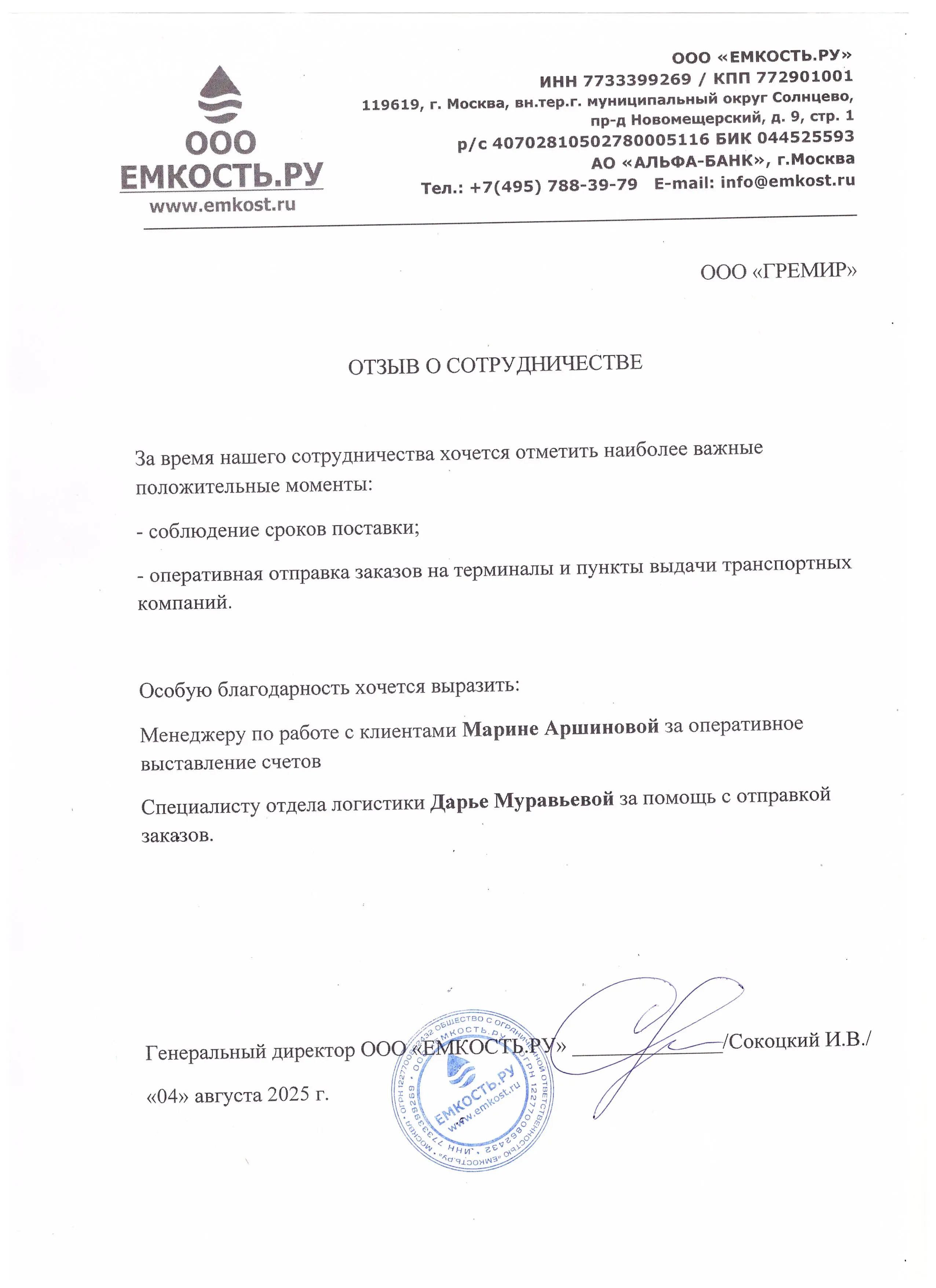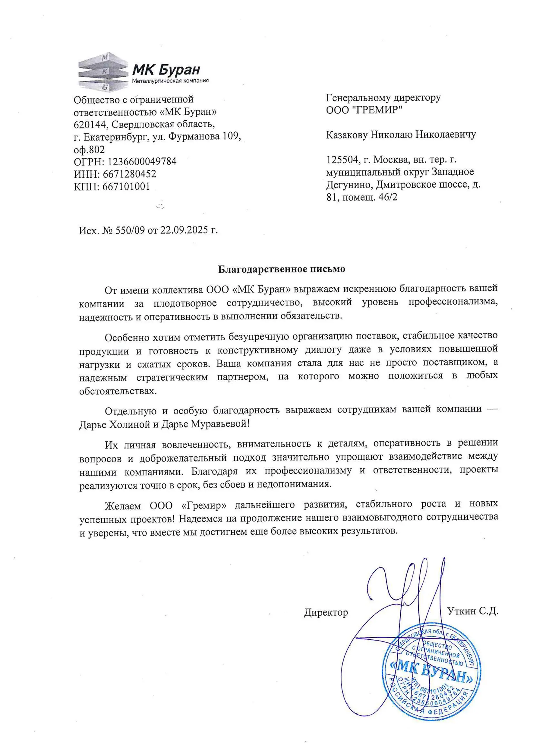 Благодарственные письма