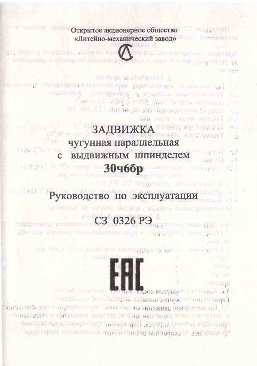Настоящее руководство по эксплуатации предназначено для изучения устройства, работы и технических характеристик задвижек 30ч6бр производства ЗАО "Литейно-механический завод" (ЛМЗ).